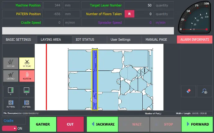 - Programinė įranga apskaičiuoja pakloto audinio ilgį ir pateikia ataskaitas